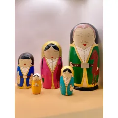 Матрёшки выполненные в калмыцком стиле состоит из 5 кукол. Расписаны вручну. Материал: дерево, акрил, лак. Высота самой большой: 19 см. Диаметр: 8 см.