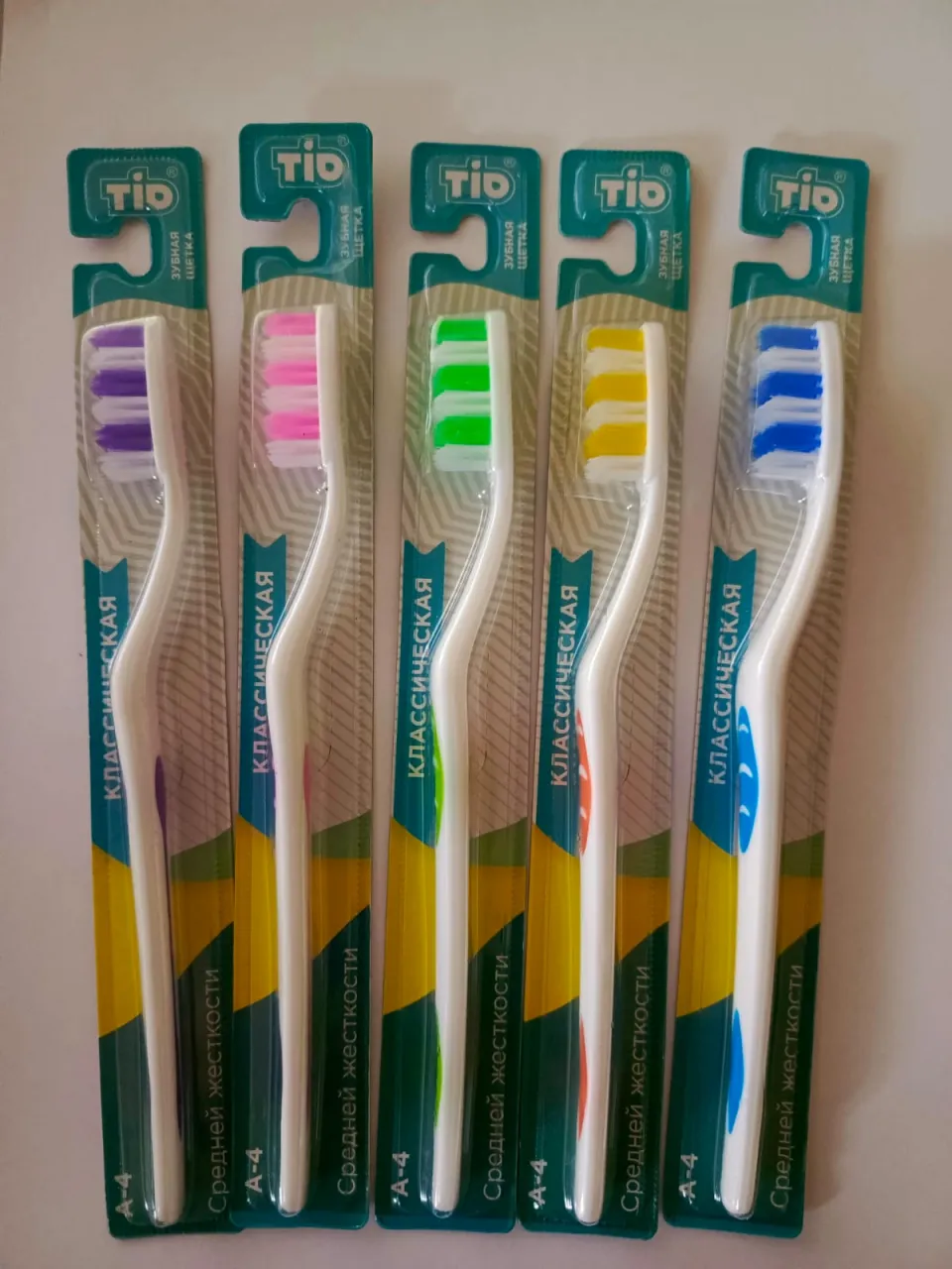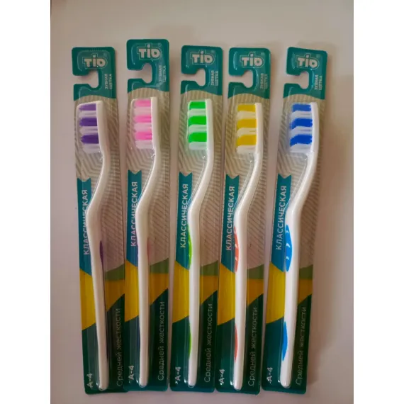 Зубные щетки ТИО для взрослых. Предназначены для комплексного очищения полости рта. Щётки представлены в 5 цветах, в наборе 5 штук (цвета собраны рандомно). У данных зубных щеток щетина средней степени жесткости. Удобно купить данный набор и в любой момент поменять зубную щетку на новую или взять с собой в поездку, а также всегда зубная щетка по рукой для гостей.